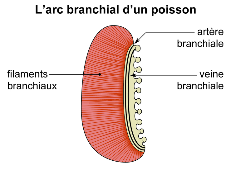 En découpant l'opercule situé en arrière de la tête du poisson, on dégage quatre fines lames rouges portées par des arcs osseux : ce sont les branchies. Chaque arc possède deux rangées de filaments branchiaux. Les branchies sont très irriguées par de nombreux capillaires sanguins, d'où leur couleur rouge. Ce sont des organes à parois minces et de grande surface favorisant les échanges respiratoires. L'oxygène dissous dans l'eau est prélevé par les branchies et passe dans le sang tandis que le dioxyde de carbone passe du sang dans l'eau : les branchies sont donc des organes d'échanges entre l'eau et le sang.